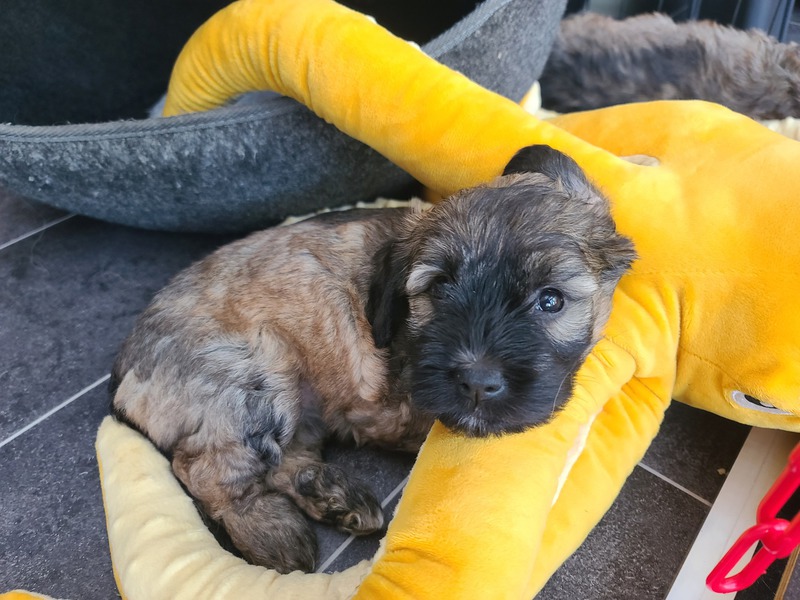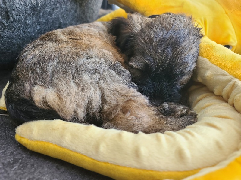 und weiter geht`s mit großen Schritten! Wir beenden die 4. Lebenswoche: Uroma Hummel hat zur Audienz gebeten und erst einmal geklärt, wie man sich einer"grande dame" angemessen nähert und sich ihr gegenüber verhält. Oma Anyway vertiefte diese Audienz nochmal in angemessener und abgeschwächter Weise. Schön für Mama Hermine solch Unterstützung im Familienverbund zu haben. Any unterstütz zudem bei der Fütterung- Sie lässt die kleinen an den Zitzen saugen, später spuckt sie den Welpen ihr Fressen zum Verzehr aus. Opa DJ Feetje hatte Tage zuvor schon äußerst angemessen signalisiert, dass er stürmische undiszipliniertes Jungvolk nicht in seinem Individualbereich duldet. Schön, Familienmitglieder zu haben, die die Aufzucht der Welpen unterstützen, begleiten und ergänzen. Für Onkel Bo, der ja nun mittlerweile auch zu einem stattlichen Herrn herangewachsen ist, sind die Wusel noch etwas spooky. Dennoch wird unser Clown bestimmt in der noch verbleibenden Zeit und wenn die Welpen etwas stabiler geworden sind die Rolle des Bespaßers äußerst gerne übernehmen. Als Mensch leiste ich meinen Beitrag und erkläre den Kleinen schon einmal, dass es gilt auf Menschenfüße ( zunächst einmal meinen) acht zu geben und ihnen auszuweichen und nicht willkürlich reinzubeißen und an Waden hochzuspringen. Das bedeutet ich begehe nicht wie der Storch im Salat die Welpenbereiche, sondern ich schreite im Schloßpantoffelgang und nehme mir schon jetzt feinfühlig meinen Raum. Sie dürfen ebenso schon den Besen und Wischer kennenlernen. Es wurde schon mehrfach angrenzend Rasen gemäht und Herr und Fräulein Gelb haben ihre erste Autofahrt/ ihren ersten Ausflug erfolgreich mit Mama Hermine gemeistert/ verschlafen. Und selbstverständlich geht es weiter mit Welpen-kuschel-Besuch