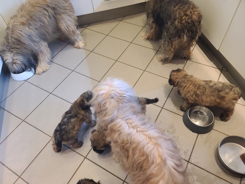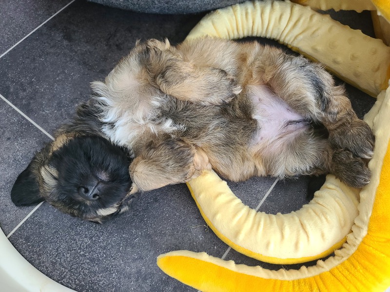 und mit großen Schritten geht es weiter... Pünktlich zu Beginn der 4. Lebenswoche: Umzug in die "Hundehütte", erste Zufütterung mit Welpenbrei, alle vierbeinigen Familienmitglieder haben ihren Anstandsbesuch gemacht- Oppa Feetje dann auch gleich schon mal den ihm gebührenden Abstand und Respekt eingefordert ;-) , neue Schlafpositionen und Plätze werden ausprobiert und die ersten Welpenbesucher waren auch schon da :-)!